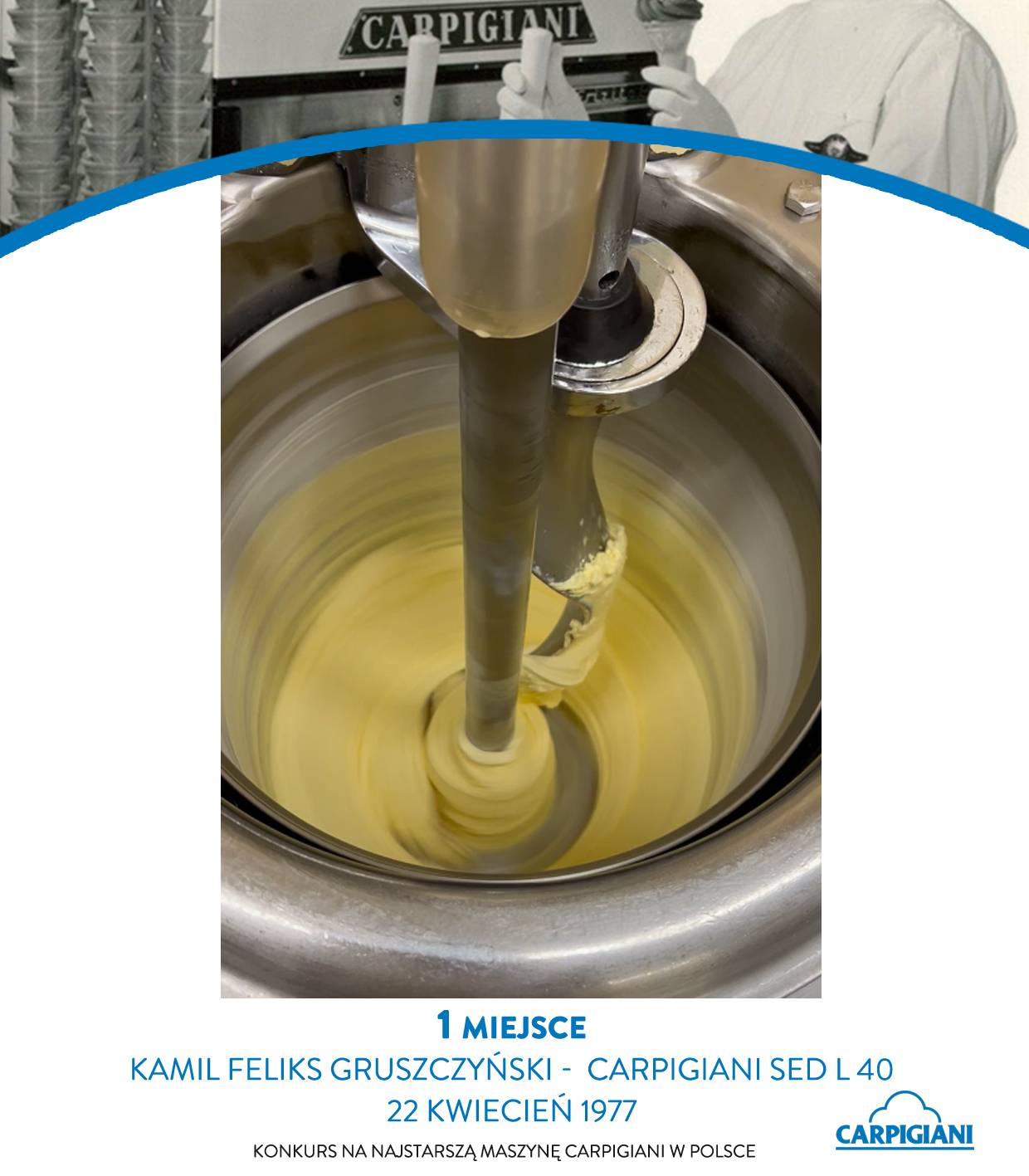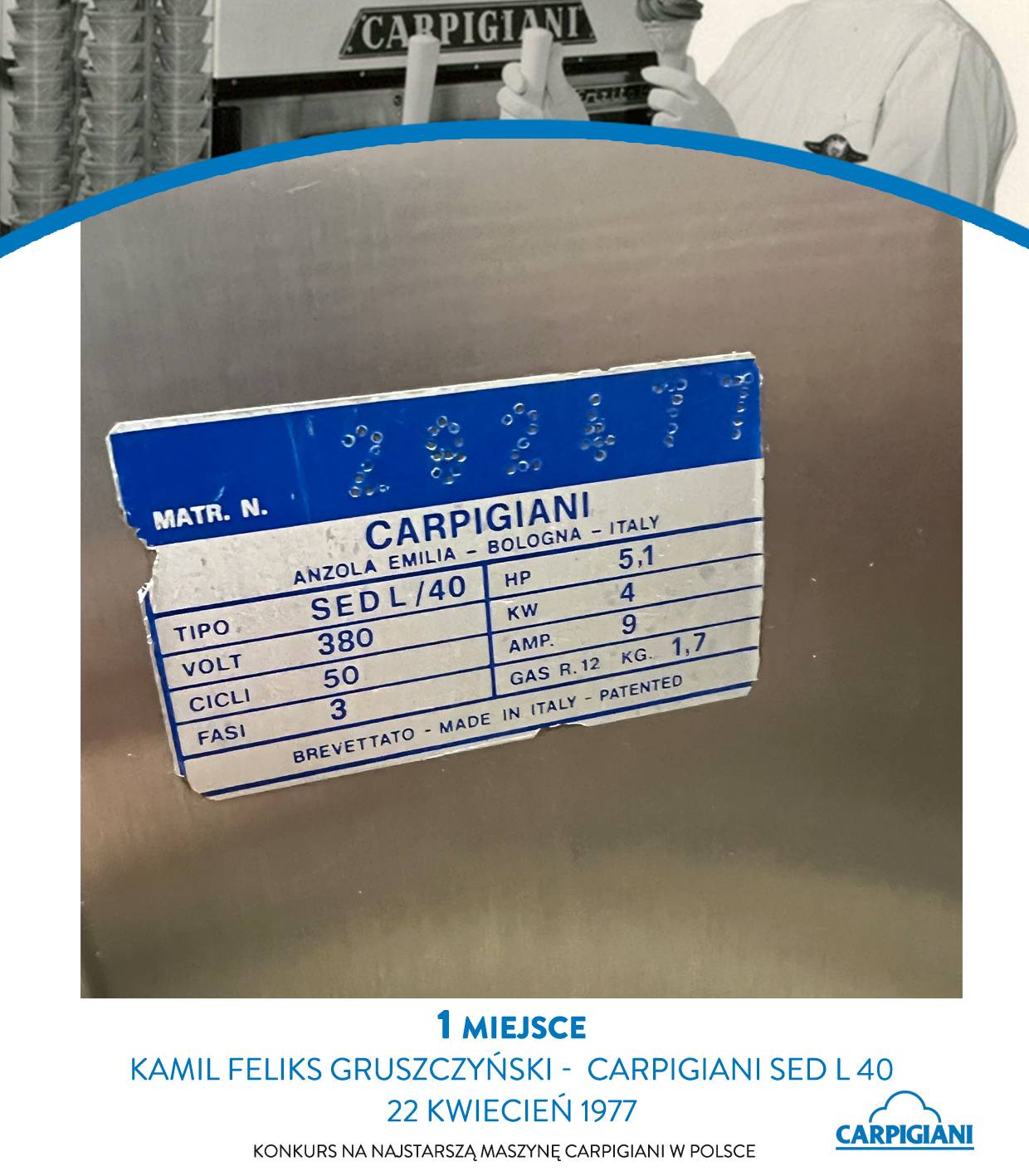 Pierwsze miejsce zdobył Kamil Feliks Gruszczyński – właściciel maszyn Carpigiani, które od blisko czterdziestu lat są częścią historii jego rodziny. Jedna z nich, model SED L40 z 1977 roku, to hybrydowa wersja z późniejszymi komponentami, wciąż w pełni sprawna i aktywnie używana. W kolekcji pana Kamila znajduje się również model SED L/40C z 1987 roku – razem tworzą unikalny duet pokazujący, jak przez dekady ewoluowała technologia Carpigiani.