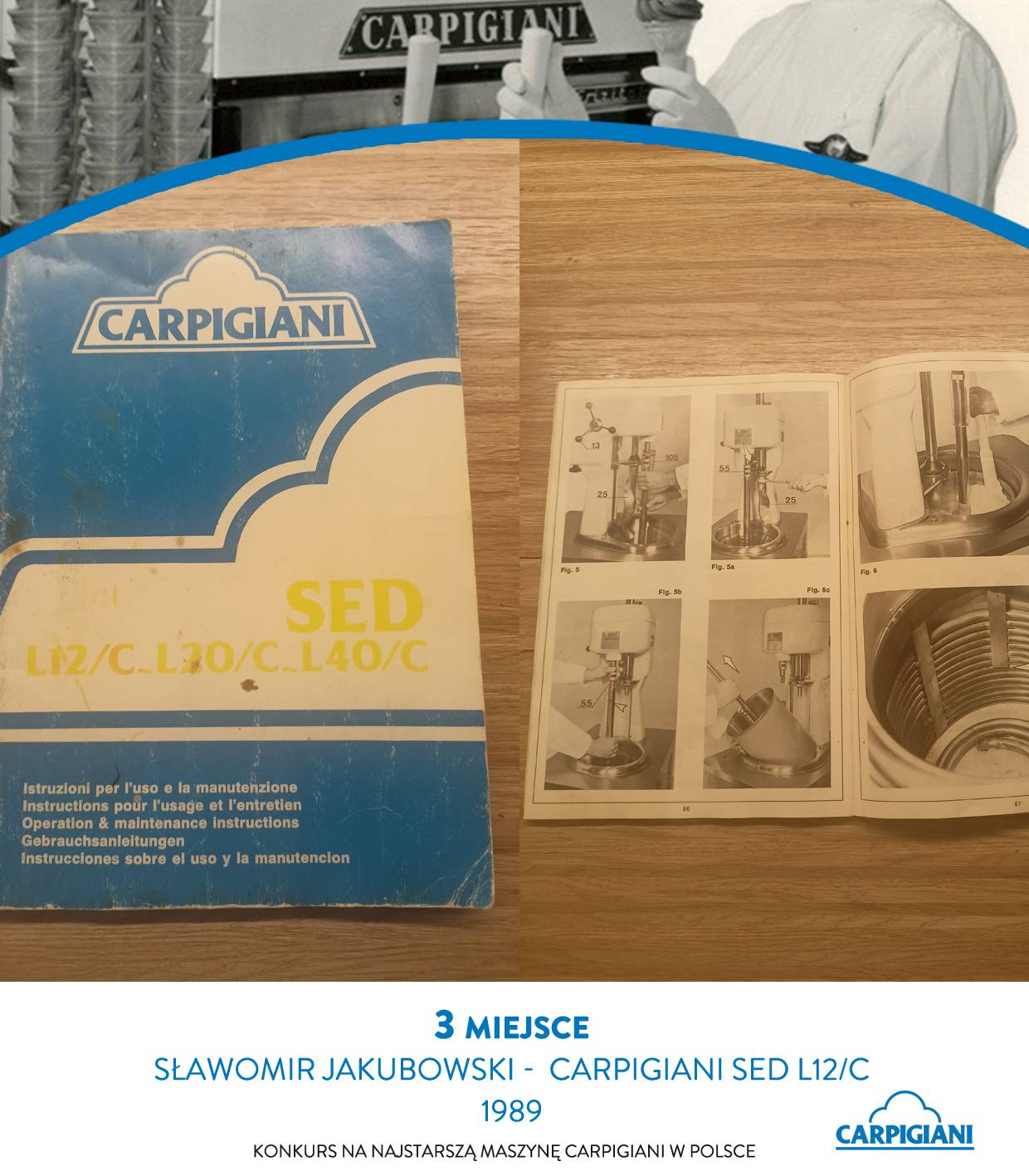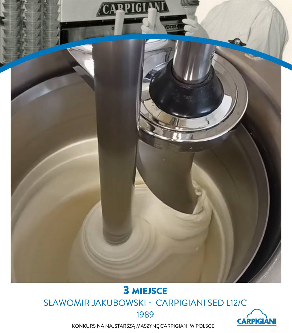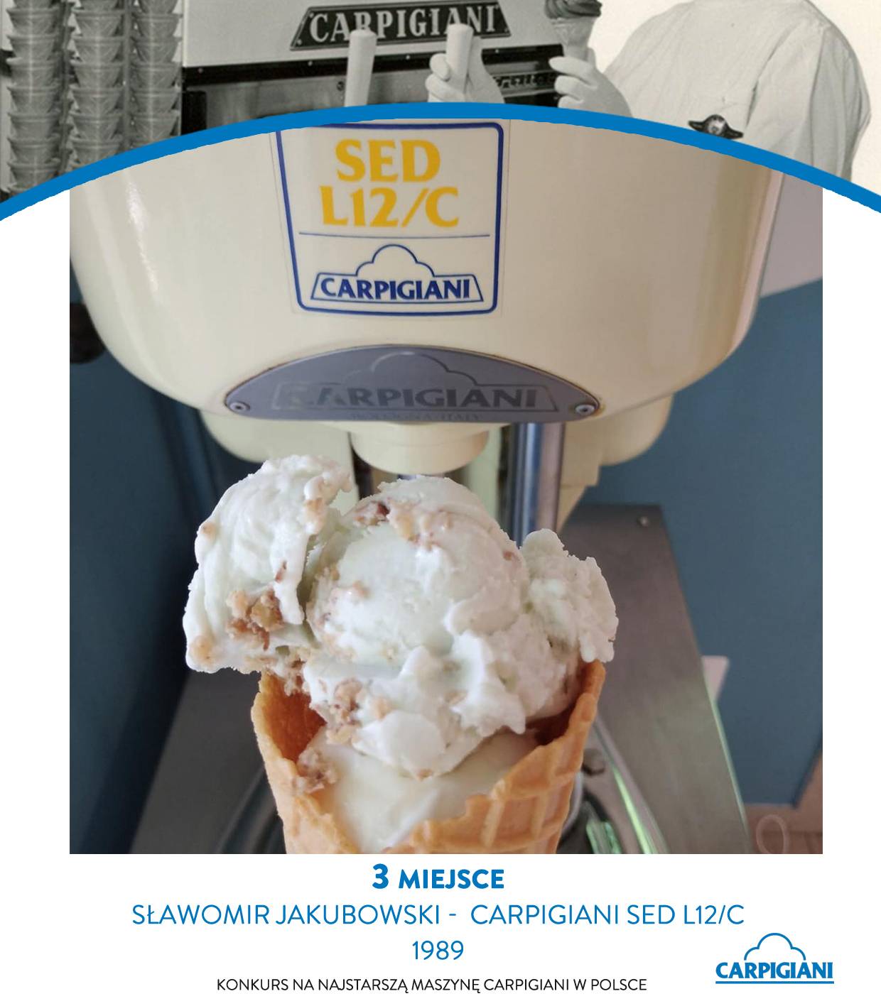 Trzecie miejsce przypadło Sławomirowi Jakubowskiemu, właścicielowi maszyny Carpigiani SED L12 C z 1989 roku, znanej w jego lokalu pod przydomkiem „Główka”. Urządzenie znajduje się w jego posiadaniu od siedmiu lat i nadal jest w doskonałej formie. Wcześniej pracowało w restauracji, dziś służy głównie do pokazów dla dzieci – pozwalając najmłodszym zobaczyć, jak dawniej produkowano lody.
